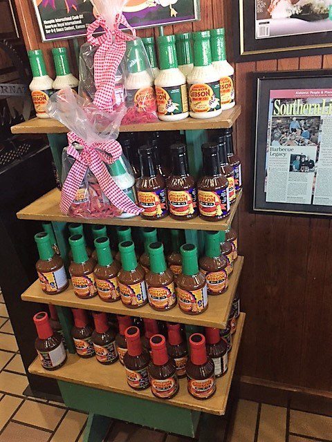 In this part of the South, you can expect to find both white and red sauce, as well as hot sauce. If you haven’t tried white sauce on barbecue, give it a try, especially on chicken. Big Bob himself created the recipe for that white sauce, and every chicken is smoked until it is done and then thoroughly baptized in it.
