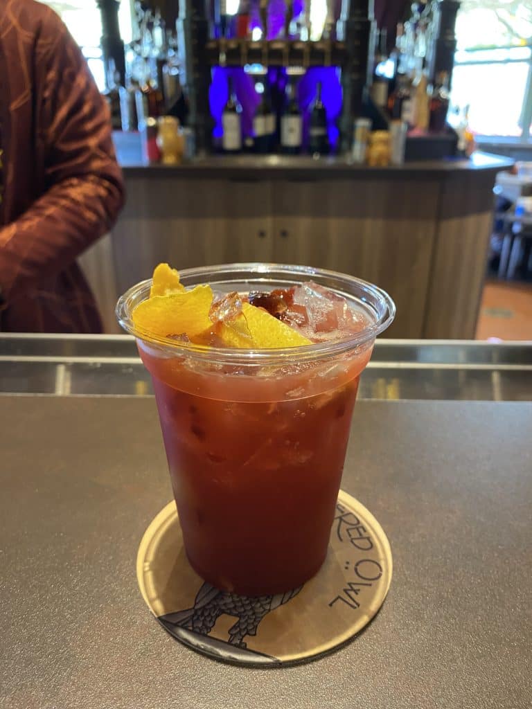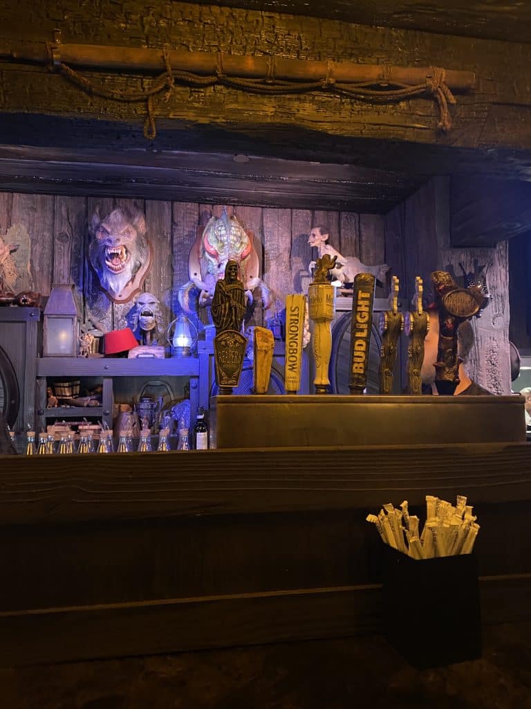 All of the restaurants in Dark Universe are quick service, but it doesn’t hinder the experience. Das Stakehaus is vampire-themed, with a spooky castle aesthetic. Here you’ll find steaks (of course) and things on stakes (duh), along with a spin on the Bloody Mary.