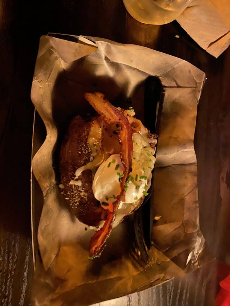 The Burning Blades Tavern is tucked to the back and, therefore, my personal favorite. You can grab items like the loaded baked potato, charred cheese bites, and cocktails as you watch the windmill come alight. De Lacey’s Cottage has the Frankenstein-shaped pretzel and cinnamon bites.