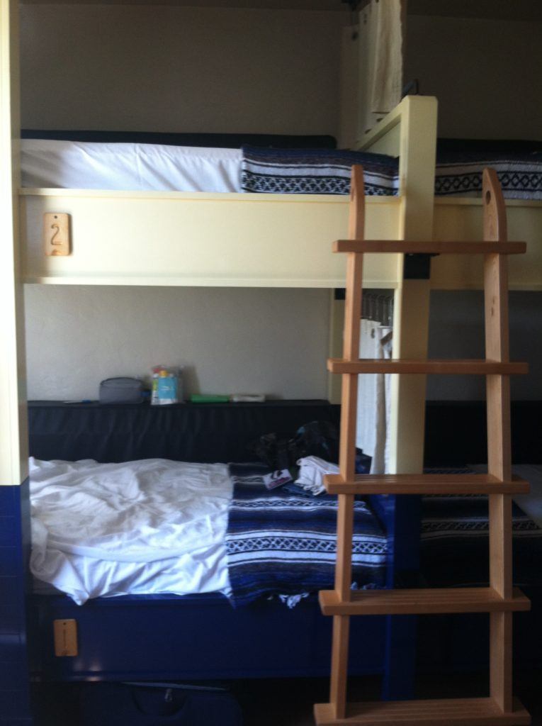 The hostel offers both dorm rooms and private rooms, ranging in price based on the room size and season. The Quad rooms have four twin-sized bunk beds in a shared space with a communal bathroom. Beds also have privacy curtains, outlets, and reading lights, and under-bed lockers are ideal for storage. The Super 8 is the same setup but with eight beds instead of four.
