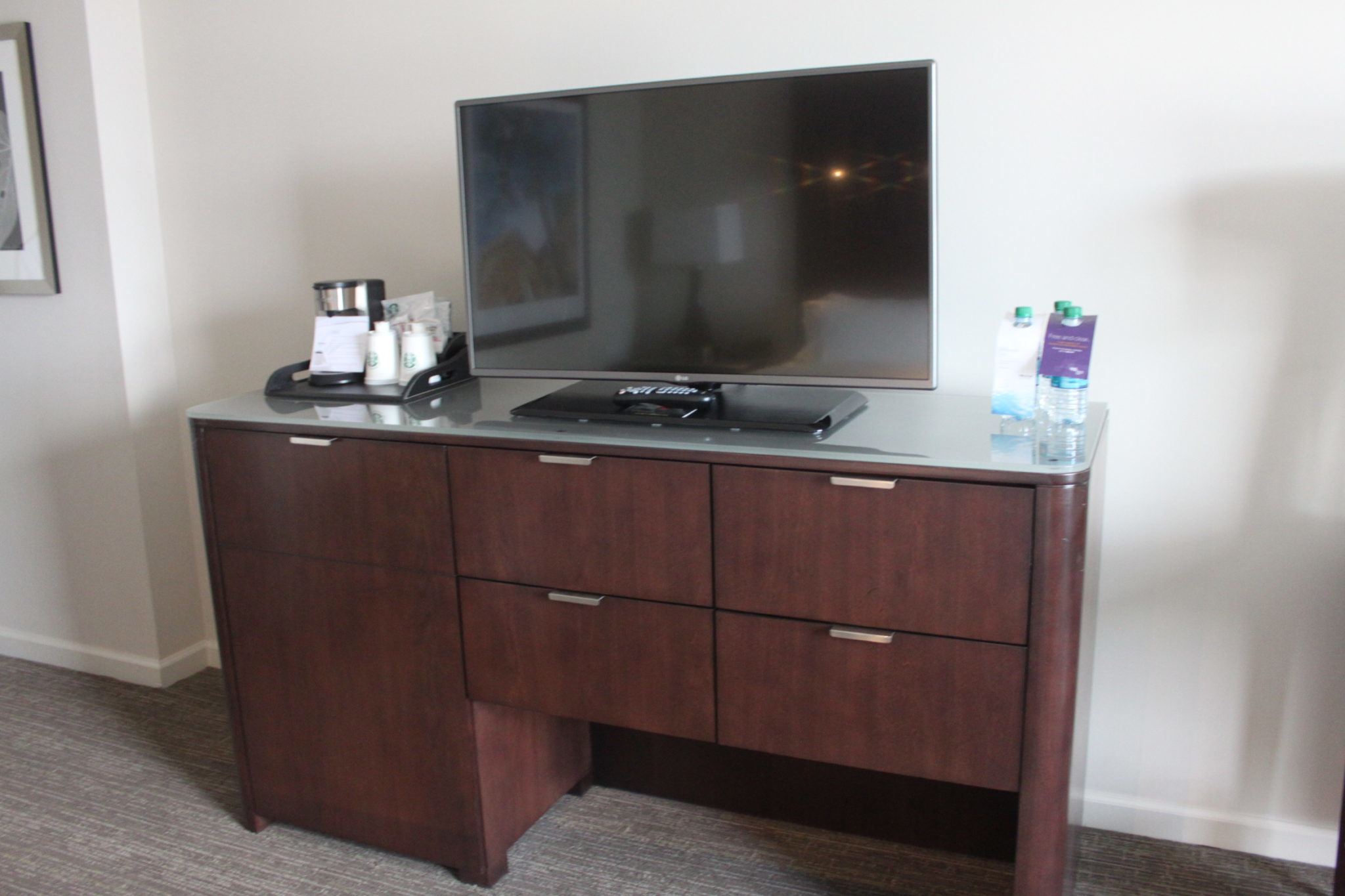 The rooms are decorated in sleek, modern, and neutral furnishings. The headboard has accent lights so you don’t disturb your partner if you want to stay up to read. The flat-screen television has premium and local channels.