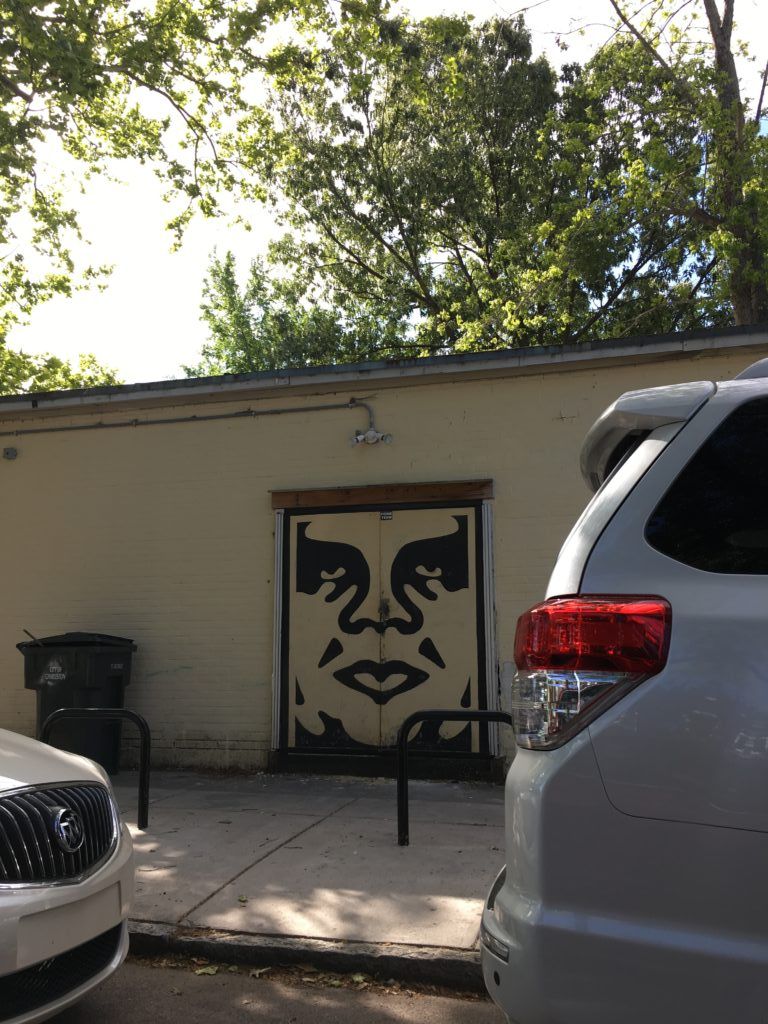Another piece by Fairey is located next to High Wire Distilling (featured), with another next to a parking lot adjacent to Groucho’s Deli (center). Jason Woodside, who has also created murals in Nashville, has a piece on the back side of The Daily.