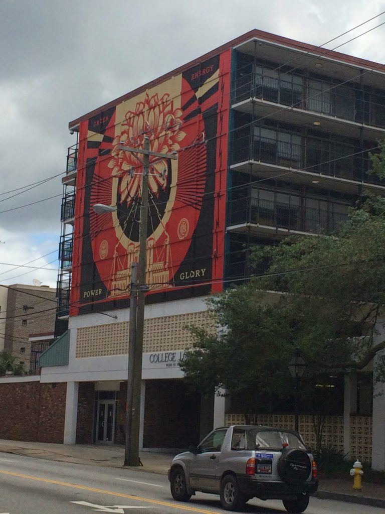 Shepherd Fairey was commissioned for a few pieces downtown, including on the campus of the College of Charleston in the dormitory known as College Lodge at College of Charleston (left, since demolished). Formerly a Howard Johnson hotel, it’s now one of the on-campus housing options.