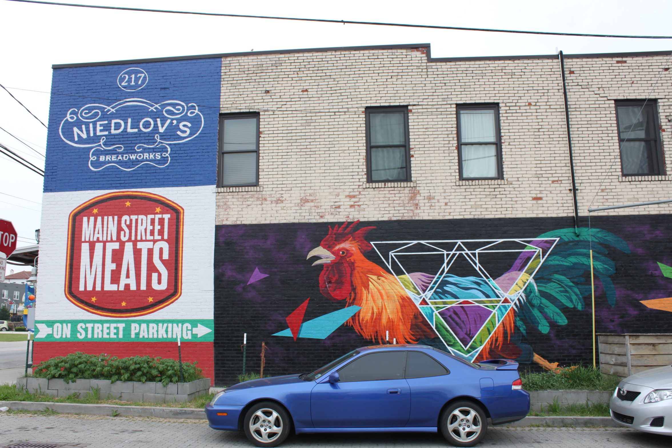 Another food-centric mural is the donut by Joseph Giri at Koch’s Bakery, above, where you can step inside for a real pastry. The wall next to Main Street Meats has its own colorful pieces by Kevin Bate, as does the walls around Get Built Chattanooga CrossFit.