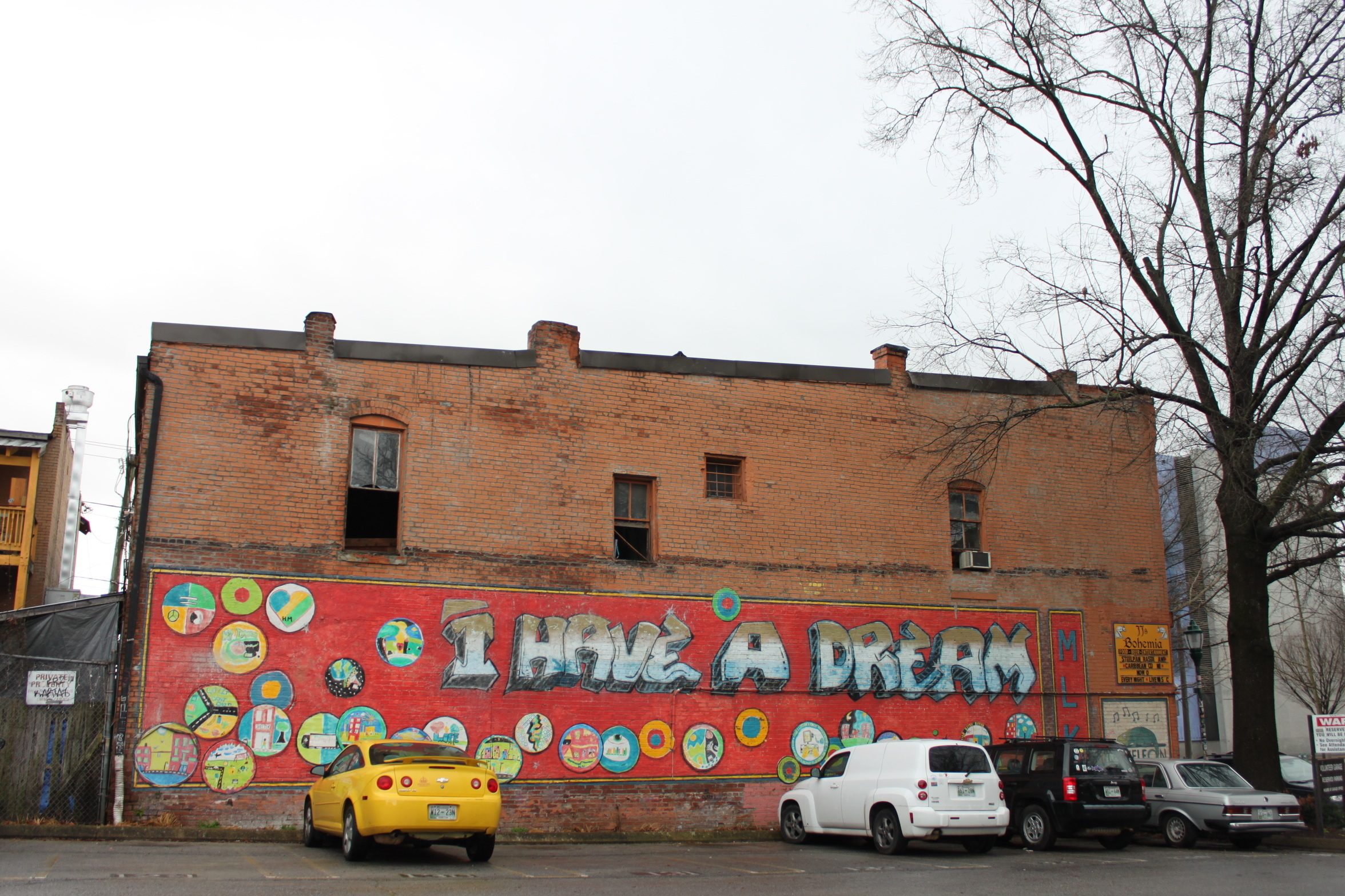 Another, saying “I Have a Dream” is near J J’s Bohemia, and another of a musician is on the side of an abandoned building. Don’t miss the portraits by Champy’s and beyond the bridge on the same street, which has a piece featuring Martin Luther King Jr. by Kevin Bate.