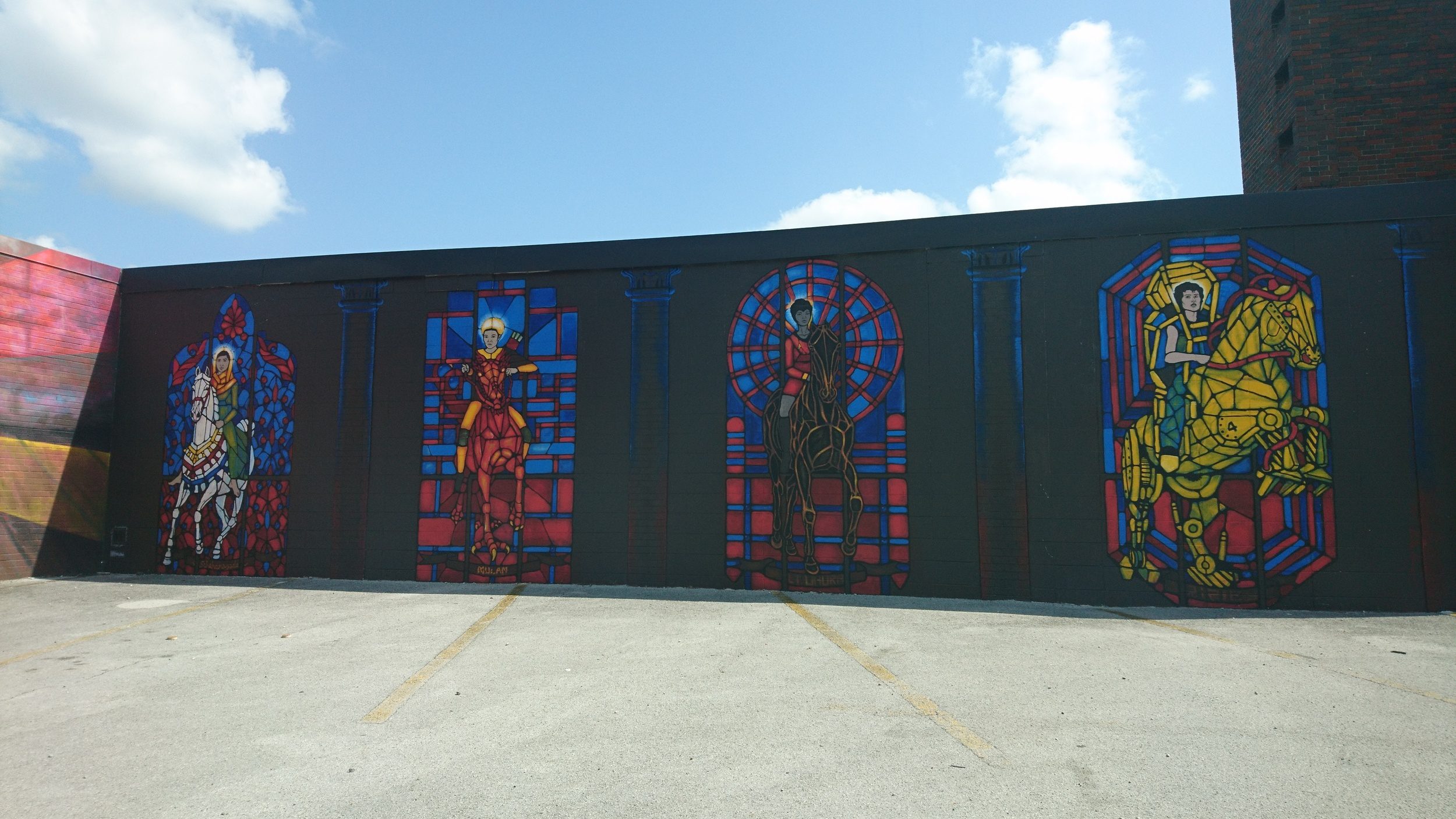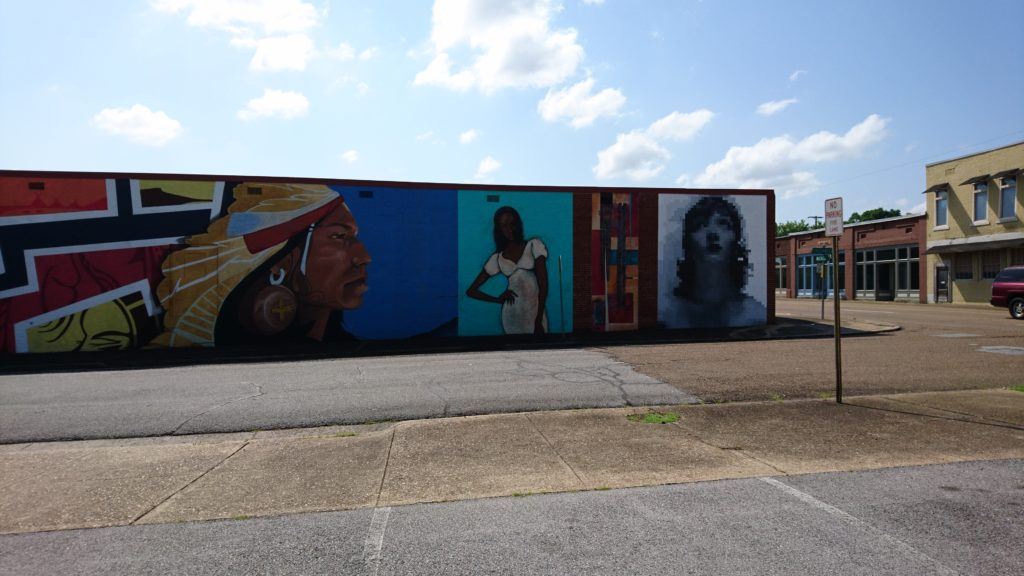 Hollie Berry created the murals to the right, which depict famous strong women throughout media, titled “Four Horse Women.” Anna Carll created the modern piece in the middle, and the piece to the left features Native Americans. All were created as a part of the McCallie Walls Mural Project.