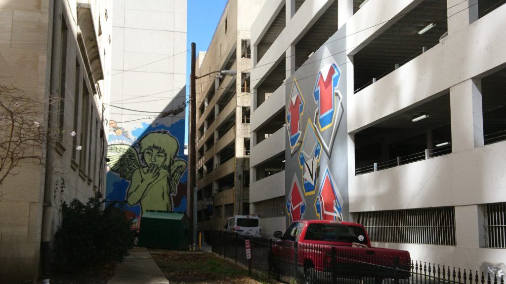 When it comes to street art in Music Row and Downtown, there aren’t many to see in the tourist zone. But there are a few exceptions. One might not call the massive guitar above the Hard Rock Cafe “street art,” but it’s a mural that has survived the city’s boom in development.