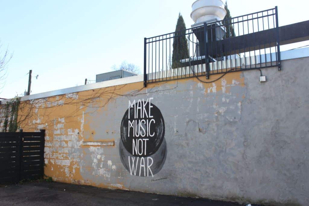 Eastside Murals’ Nashville at Heart on 12th Avenue is a colorful representation of the Music City. And a piece entitled “Make Music Not War” sums up the attitude of the city, located on the side of Epice and painted by Relax Max.